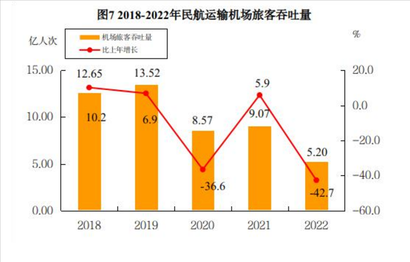 2018年至2022年民航運輸機場旅客吞吐量。來源于2022年民航行業(yè)發(fā)展統(tǒng)計公報