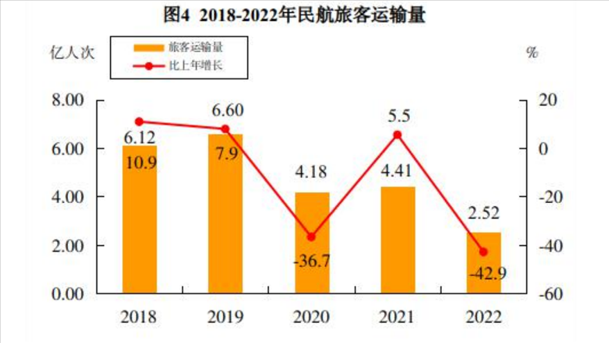 2018年至2022年民航旅客運輸量。來源于2022年民航行業(yè)發(fā)展統(tǒng)計公報