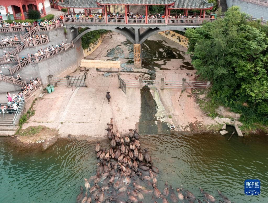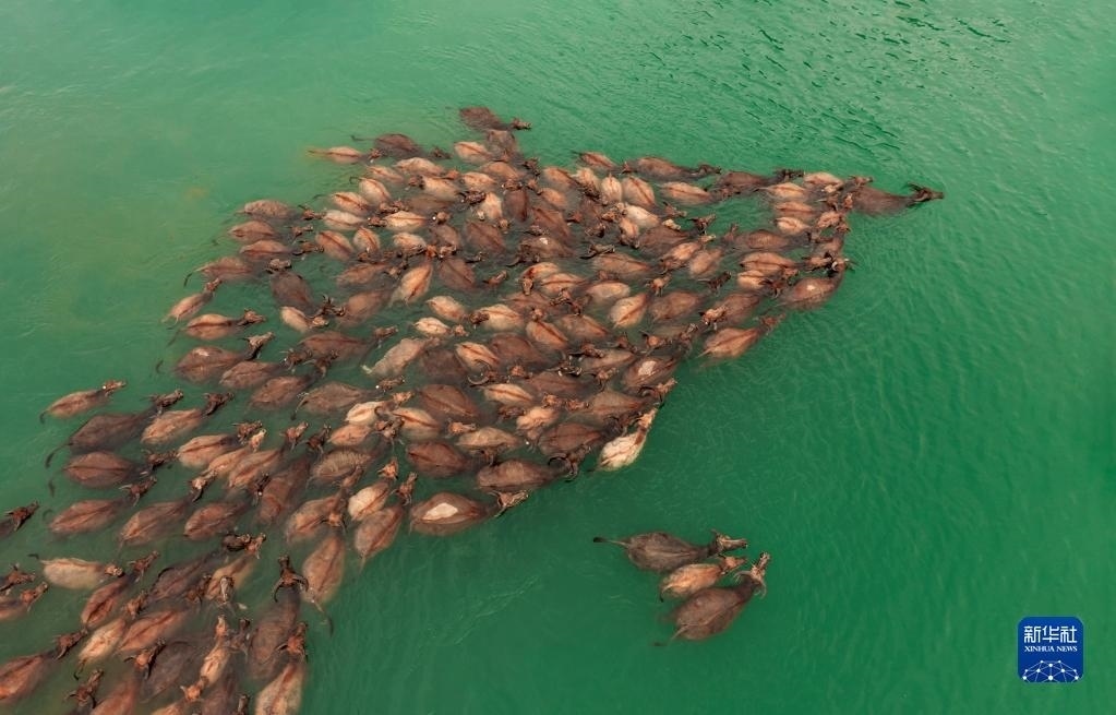 5月13日,在南充市蓬安縣相如鎮(zhèn)油房溝村嘉陵江段,成群結(jié)隊(duì)的水牛渡江(無人機(jī)照片)。