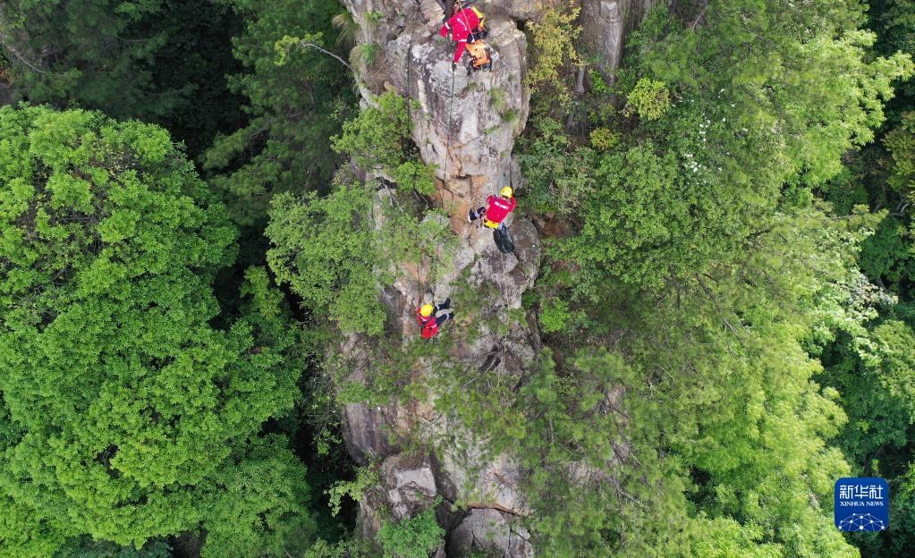 5月14日,張家界市武陵源區(qū)山地應(yīng)急救援隊隊員系上繩索在懸崖峭壁間撿拾垃圾(無人機照片)。
