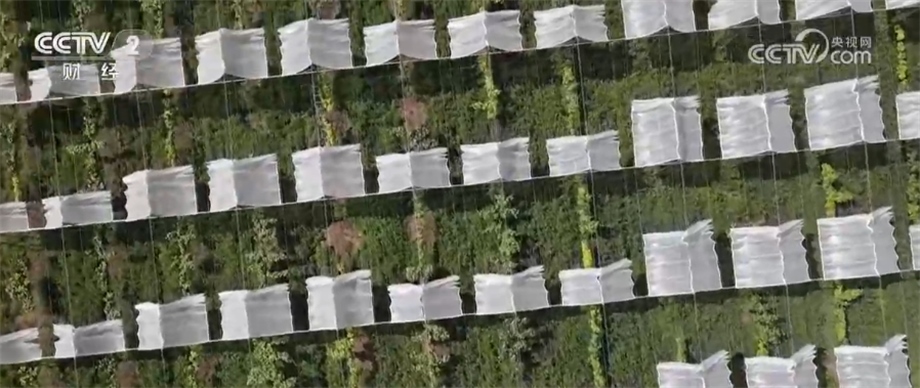 總臺央視記者 金荷淼:這里是陜西楊凌的一處獼猴桃產(chǎn)業(yè)園,我所在的位置是一個黃肉獼猴桃的標(biāo)準(zhǔn)化種植基地,可以看到現(xiàn)場是采用了一個壟上栽培的方式,保留了比較寬的行距,能夠有利于排水。而且我們發(fā)現(xiàn),每一支主干是分出來兩根藤蔓,在藤蔓之上做了一個這樣的水平棚架,水平棚架的好處就在于能夠保證每一個獼猴桃的果實都能夠接受同等程度的水分和光照,從而使果實的大小質(zhì)量均勻統(tǒng)一。