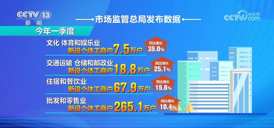 市場監(jiān)管總局發(fā)布數(shù)據(jù)顯示,今年一季度,文化、體育和娛樂業(yè),交通運輸、倉儲和郵政業(yè),住宿和餐飲業(yè),批發(fā)和零售業(yè)等行業(yè)新設個體工商戶分別為7.5萬戶、18.8萬戶、67.9萬戶、265.1萬戶,同比分別增長39.0%、25.1%、19.8%、10.4%。