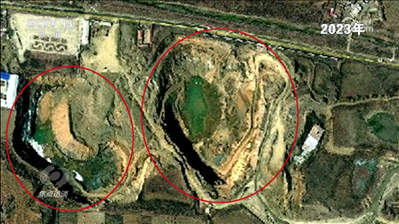 這兩個大坑真的如這位負責人所說變化不大嗎?記者查閱了從2018年至今的衛(wèi)星圖片,上面清晰顯示:2018年,北面大坑上面原來有廠房,還有道路,南面是一個尾礦庫。2019年,地塊南北同時出現(xiàn)新挖的坑,之后這兩個坑不斷擴大。到了2020年,北面的廠房已經(jīng)不見了,南面的坑也在變大。2021年、2022年,兩個大坑都在變大變深,逐漸靠攏,到了2023年,最終形成了現(xiàn)在的樣子。