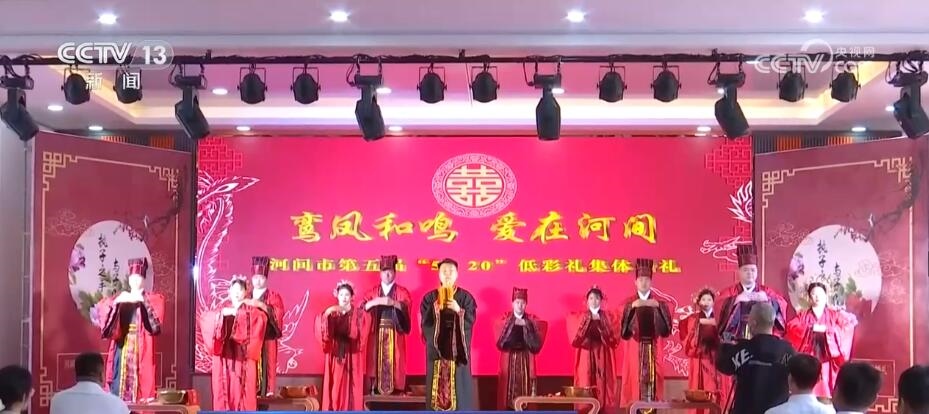 在江西貴溪、山東巨野等地,五月份組織了多場主題為“不要彩禮要幸福”的集體婚禮,倡導(dǎo)新人們選擇簡約的婚禮儀式。在河北省河間市的集體婚禮現(xiàn)場,紅毯艷艷、絲竹裊裊,新人們身著傳統(tǒng)禮服,在證婚人、主婚人的見證下,按照周制漢婚的傳統(tǒng)儀式開啟他們愛的旅程。