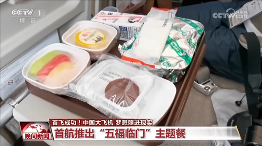 首航之旅,處處充滿著新鮮感。經(jīng)濟艙的這款餐食叫“五福臨門”,主食是臘味煲仔飯,搭配三色水果拼盤、C919首航特色芒果布丁、東航自制巧克力酥餅以及大白兔牛奶。航班順利降落后,在機艙內(nèi),大家唱響《歌唱祖國》,慶祝首航。