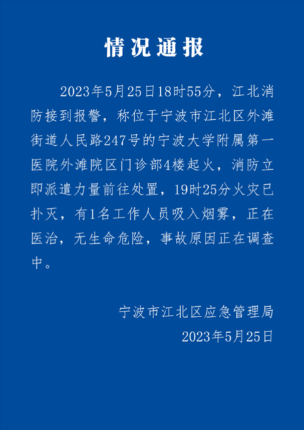 ·官方通報寧波一醫(yī)院發(fā)生火災(zāi):1人吸入煙霧,無生命危險。