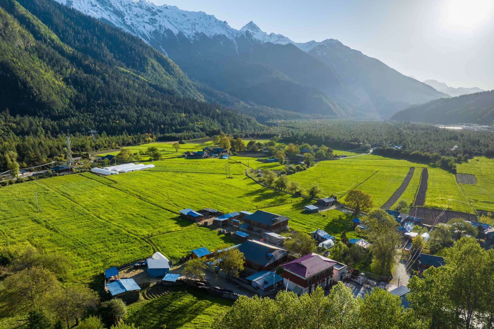 2023年5月24日,西藏林芝,波密縣松宗鎮(zhèn)龍亞村,民居、樹木和遠處的雪山相映成趣。視覺中國