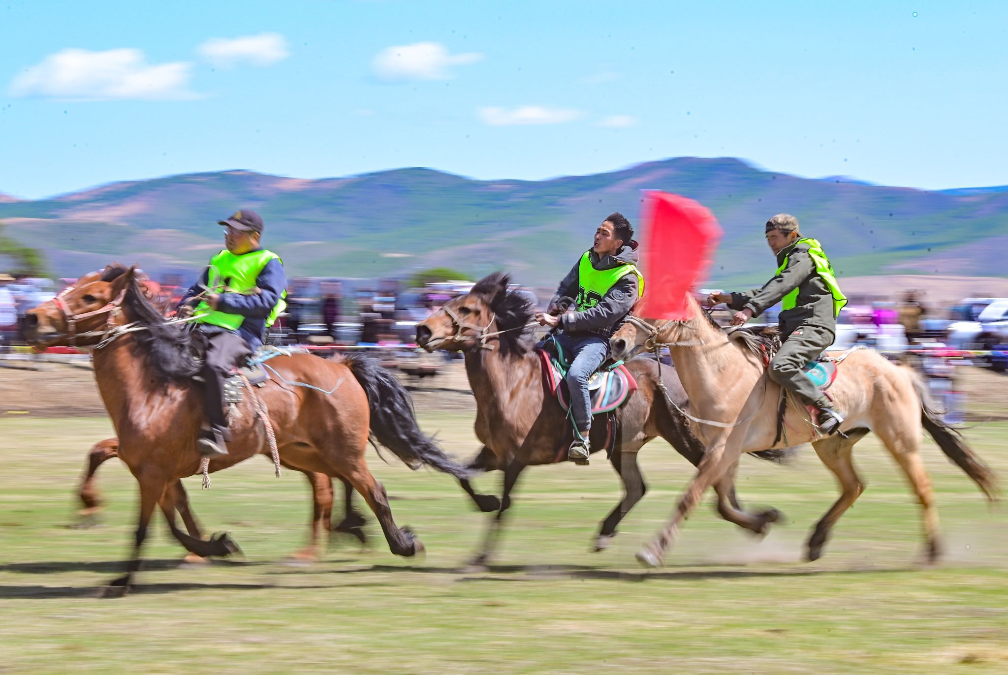 2023年5月26日,內(nèi)蒙古興安盟,科爾沁右翼前旗德伯斯鎮(zhèn)阿日林一合嘎查舉行首屆那達慕,設(shè)置的賽馬、布魯、搏克、拔河等傳統(tǒng)體育娛樂項目,吸引嘎查周邊500余名牧民參加比賽,喜慶牧業(yè)豐收季。視覺中國