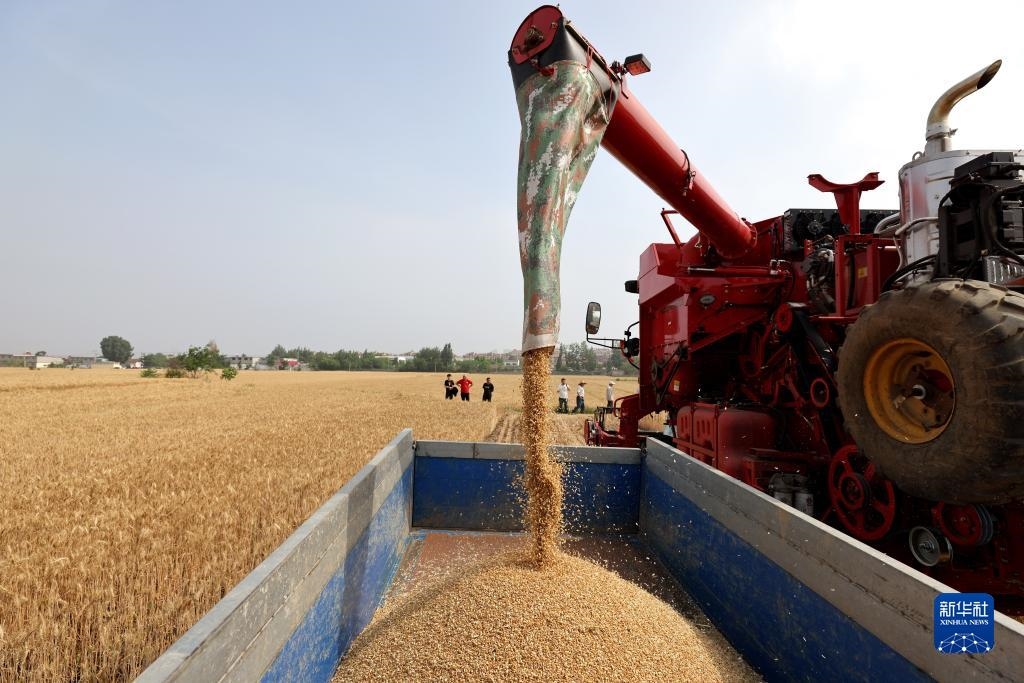 5月27日,在山東省棗莊市光明路街道田莊村麥田里,農(nóng)民駕駛農(nóng)機(jī)收獲小麥。