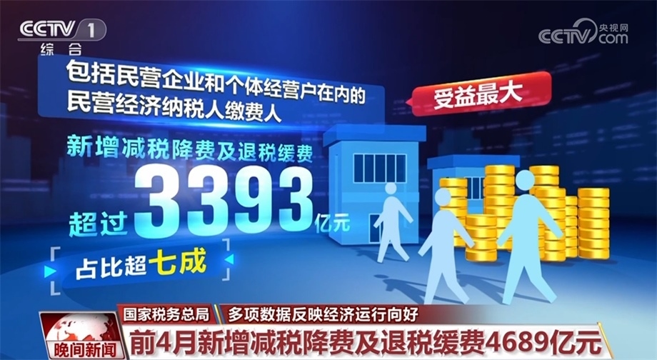 國(guó)家稅務(wù)總局?jǐn)?shù)據(jù)顯示,今年1—4月,全國(guó)新增減稅降費(fèi)及退稅緩費(fèi)4689億元。分經(jīng)濟(jì)類型看,包括民營(yíng)企業(yè)和個(gè)體經(jīng)營(yíng)戶在內(nèi)的民營(yíng)經(jīng)濟(jì)納稅人繳費(fèi)人新增減稅降費(fèi)及退稅緩費(fèi)超過(guò)3393億元,占比超七成,受益最大。