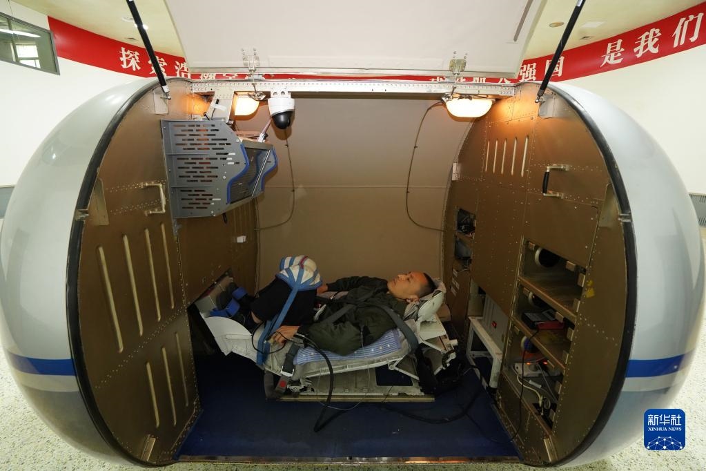 神舟十六號航天員朱楊柱在進行振動體驗(2022年4月27日攝)。新華社發(fā)(王夏陽 攝)