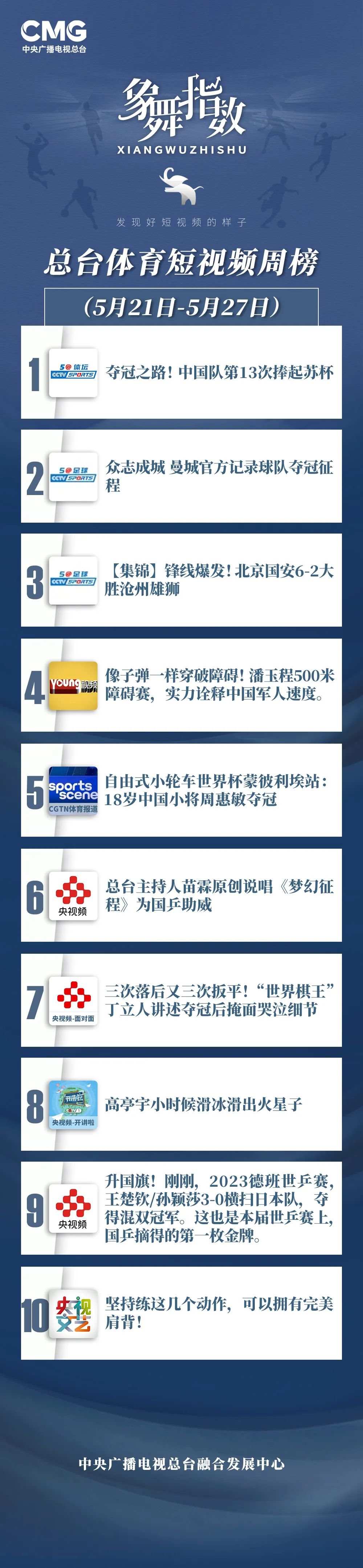 中央廣播電視總臺“象舞指數(shù)”評議品牌,推出體育短視頻周榜、總臺體育短視頻周榜。在5月21日—5月27日,以下內(nèi)容獲得矚目: