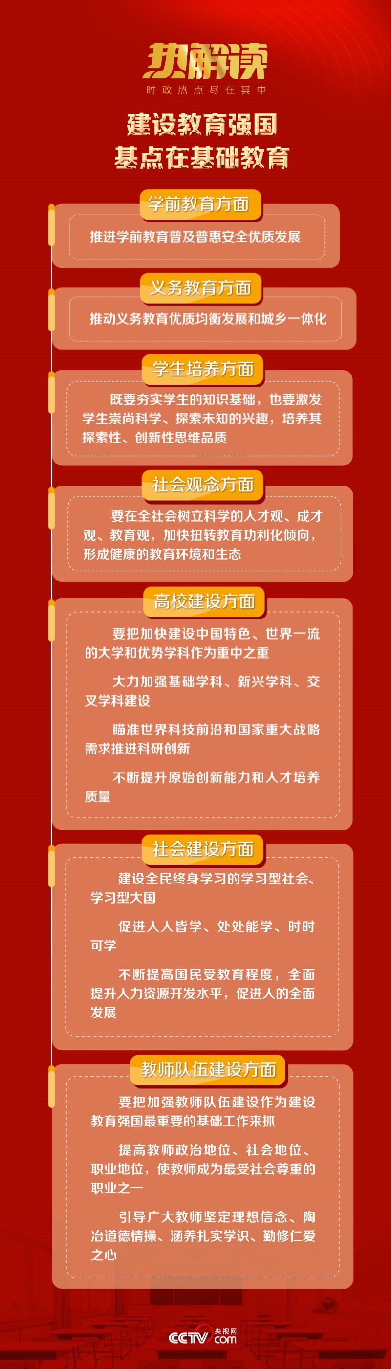 這次集體學(xué)習(xí)中,在強(qiáng)調(diào)“要堅(jiān)持把高質(zhì)量發(fā)展作為各級(jí)各類教育的生命線”時(shí),總書記首先提到的就是基礎(chǔ)教育。他指出,建設(shè)教育強(qiáng)國(guó),基點(diǎn)在基礎(chǔ)教育。基礎(chǔ)教育搞得越扎實(shí),教育強(qiáng)國(guó)步伐就越穩(wěn)、后勁就越足。