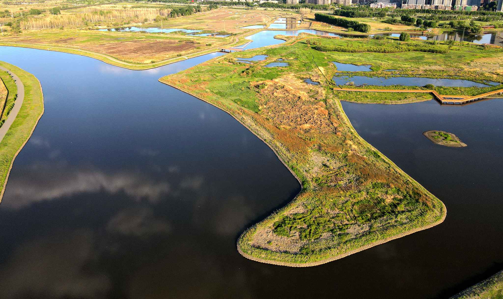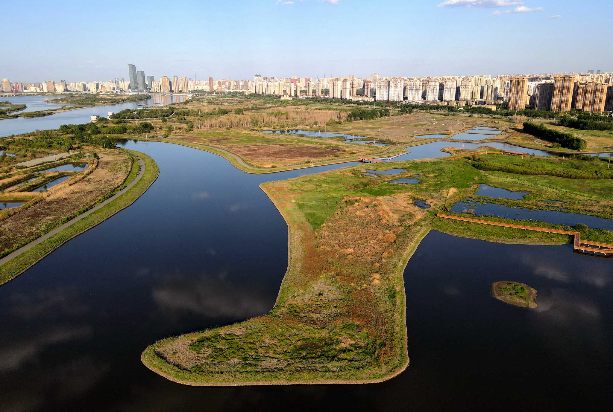 2023年5月30日,哈爾濱,松花江畔,外灘濕地中,“靴子”小島草木茂盛,綠意盎然。視覺中國