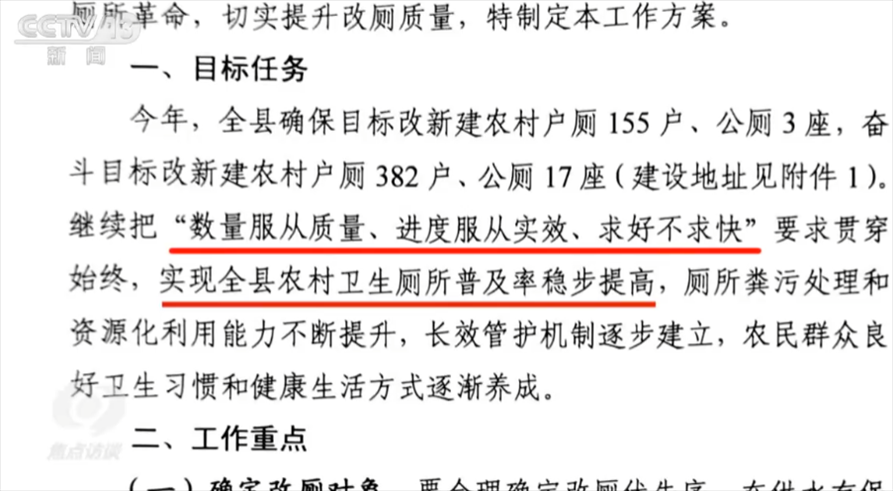 央視網(wǎng)消息(焦點訪談):“小廁所、大民生”。廁所問題不僅關系農(nóng)村人居環(huán)境的改善,也關系廣大人民群眾生活品質的提升。目前,全國農(nóng)村衛(wèi)生廁所普及率超過73%,“廁所革命”走向縱深。然而,記者在調(diào)查中發(fā)現(xiàn),有些地區(qū)的廁改成績很“亮眼”,廁改成效卻很“扎眼”,這關乎百姓切身利益的大事兒,要經(jīng)得起“回頭看”、再檢驗。