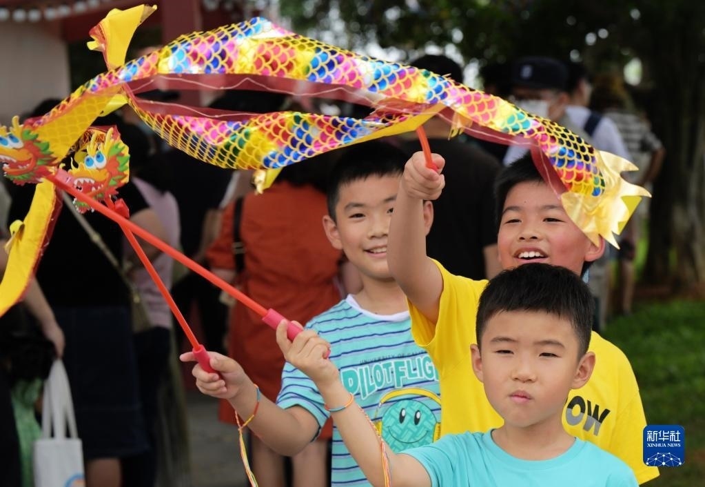 6月3日,廈門小學生在2023海峽兩岸(集美)龍舟文化節(jié)活動現場體驗舞龍。