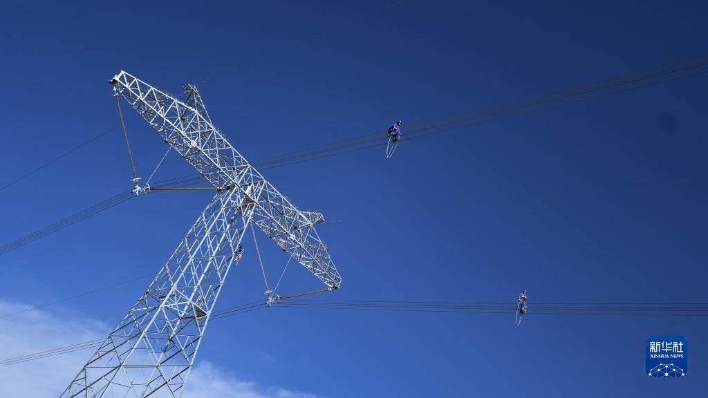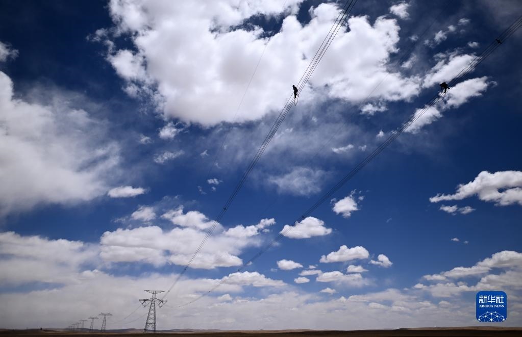 在青海省海西蒙古族藏族自治州格爾木市唐古拉山鎮(zhèn)境內(nèi),檢修人員在走線巡檢中(6月3日攝)。
