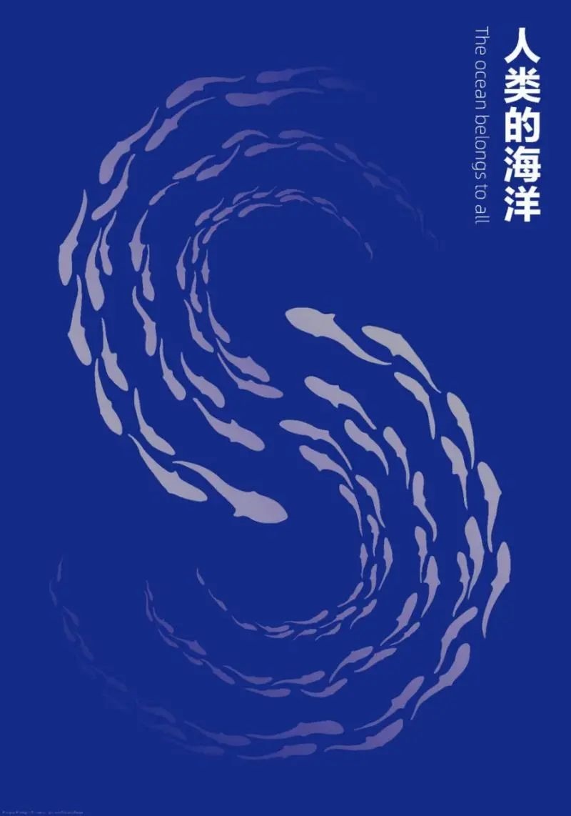 《人類的海洋》采用“S”形魚(yú)群為基本骨架,魚(yú)群錯(cuò)落交織游向海洋深處,寓意良好的海洋生態(tài)環(huán)境對(duì)魚(yú)群等海洋生物穩(wěn)定棲息的益處。造福于海洋,同時(shí)也是造福于人類。