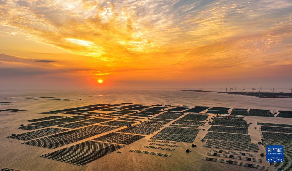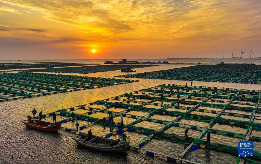 6月5日拍攝的朝霞映襯下的榮成市石島管理區(qū)桑溝灣海洋牧場生態(tài)網(wǎng)箱養(yǎng)殖區(qū)(無人機照片)。