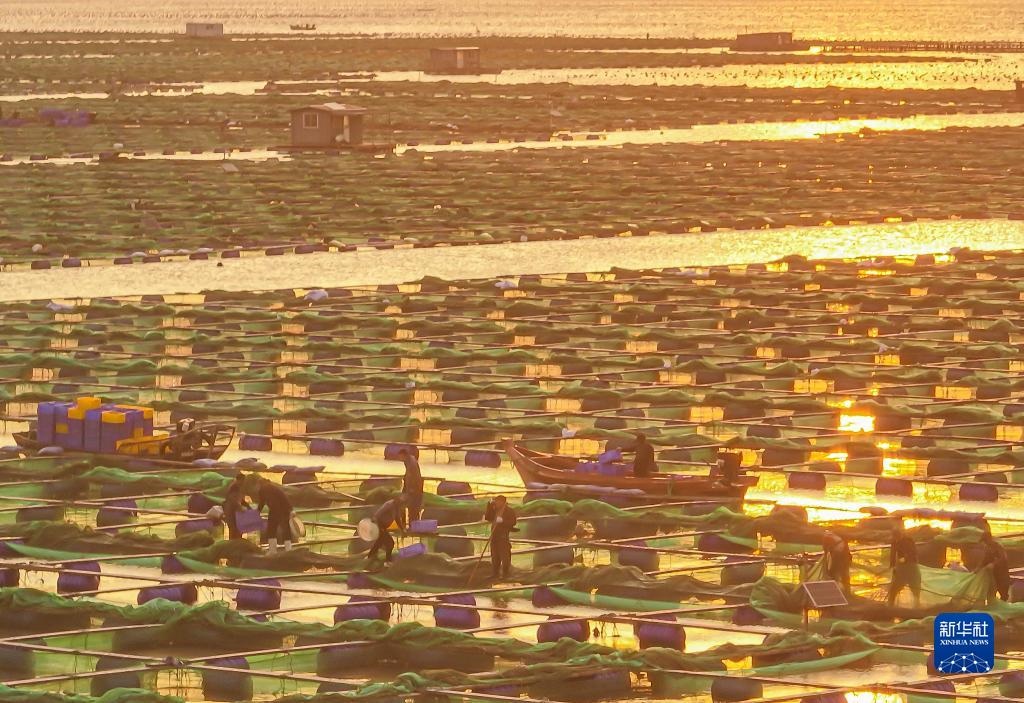 6月5日,在榮成市石島管理區(qū)桑溝灣海洋牧場生態(tài)網(wǎng)箱養(yǎng)殖區(qū),漁民在進(jìn)行海上養(yǎng)殖作業(yè)(無人機照片)。