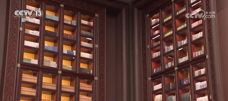 “國家書房”四周設(shè)置15組書柜,營造出中國風(fēng)格的藏書空間,共陳列近3萬冊(cè)新中國精品出版物。正前方的中間位置陳列馬列主義經(jīng)典著作、黨的創(chuàng)新理論著作等重點(diǎn)圖書,左右兩側(cè)陳列各省區(qū)市地方文庫和古籍整理出版物。大廳頂部中央藻井內(nèi)的星空穹頂,圖案選用宋代石刻天文圖。