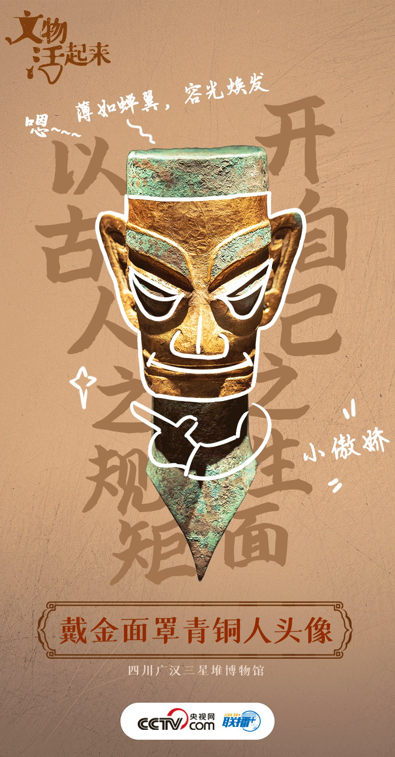 據(jù)已有統(tǒng)計(jì),三星堆一號坑、二號坑共出土了57件樣式各異的青銅人頭像,其中只有4件覆蓋黃金面具,而這尊是三星堆出土的金面銅人頭像中保存最完好的一件。黃金面具如同一張薄如蟬翼的面膜,厚度僅有0.2毫米。古蜀以金為尊,在青銅人頭像上包貼金面罩與宗教習(xí)俗有密切關(guān)系,同時也是其高貴、權(quán)威身份的象征。