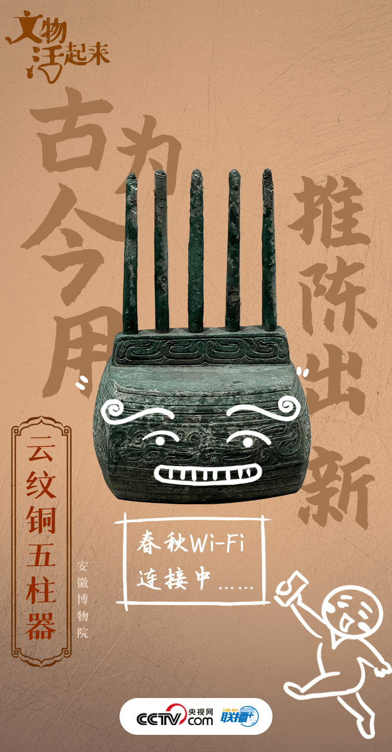 這件文物名為“云紋銅五柱器”,斷代為西周(公元前1046年-公元前771年),用途待考。早年有人認(rèn)為它是樂器,該觀點(diǎn)很快被否定。后有人認(rèn)為是某種器物的底座,亦是語焉不詳。還有人認(rèn)為是古人祭祀祖先時插先祖牌位的底座,這種觀點(diǎn)也有待于學(xué)術(shù)界論證。