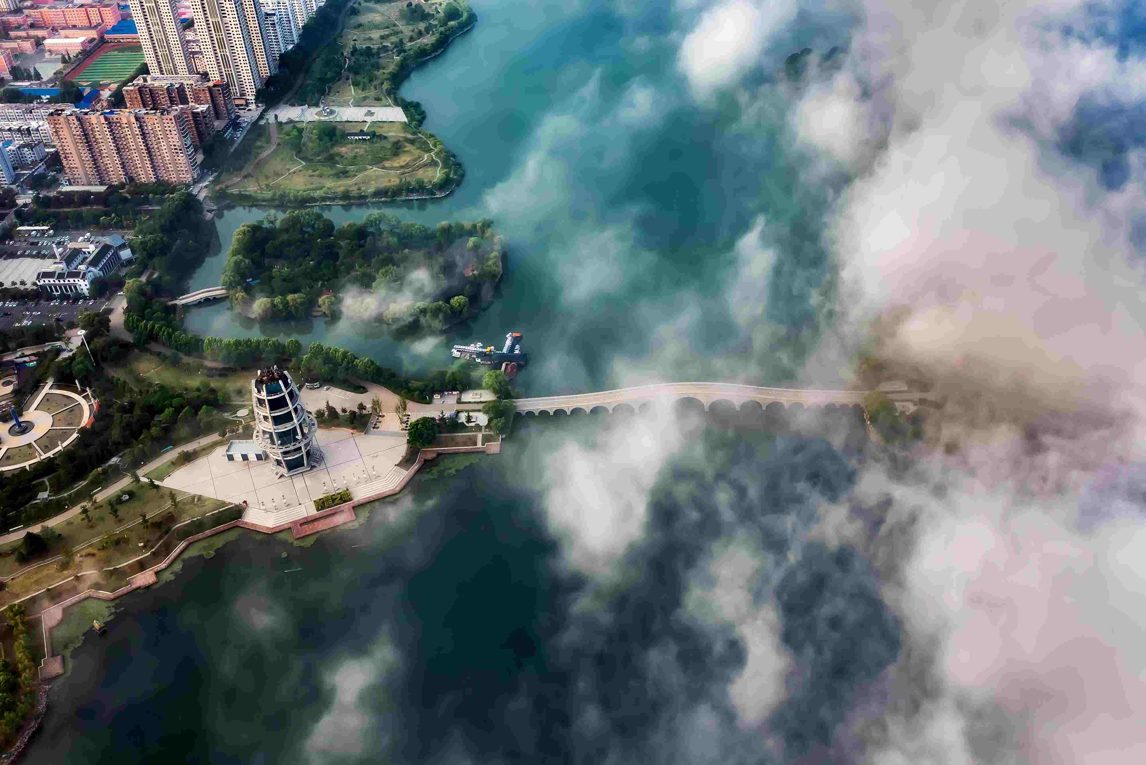 2023年6月11日,江蘇連云港東??h,城市上空云霧繚繞,蔚為壯觀。 視覺(jué)中國(guó)