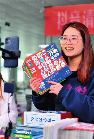廊坊市永清經(jīng)濟(jì)開發(fā)區(qū)京聯(lián)集團(tuán)館配圖書聯(lián)合現(xiàn)采基地,工作人員在電商平臺直播銷售圖書(2023 年 3 月 26 日攝) 駱學(xué)峰攝 / 本刊