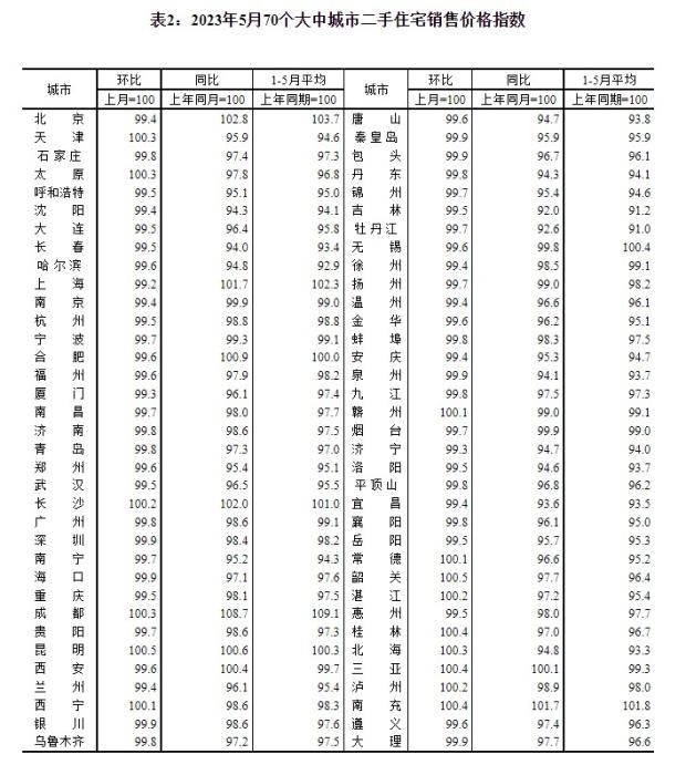 2023年5月70個(gè)大中城市二手住宅銷售價(jià)格指數(shù)。 截圖自國(guó)家統(tǒng)計(jì)局官網(wǎng)
