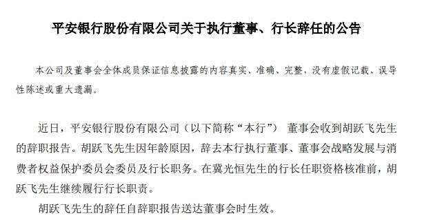 6月9日,平安銀行發(fā)布公告,原行長胡躍飛辭職。這位已在平安工作了數(shù)十年的“老將”因年齡原因辭去該行執(zhí)行董事、董事會戰(zhàn)略發(fā)展與消費(fèi)者權(quán)益保護(hù)委員會委員及行長職務(wù)。