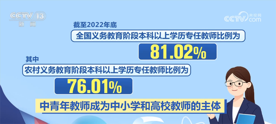 近年來(lái),“特崗計(jì)劃”、“三區(qū)”人才支持計(jì)劃教師專項(xiàng)計(jì)劃等源源不斷地為鄉(xiāng)村學(xué)校補(bǔ)充高素質(zhì)教師。優(yōu)師計(jì)劃、師范教育協(xié)同提質(zhì)計(jì)劃、國(guó)優(yōu)計(jì)劃等的實(shí)施,也在助力優(yōu)秀教師的培養(yǎng)。我國(guó)各級(jí)各類教師隊(duì)伍學(xué)歷不斷提高、年齡結(jié)構(gòu)不斷優(yōu)化。截至2022年底,全國(guó)義務(wù)教育階段本科以上學(xué)歷專任教師比例為81.02%,其中,農(nóng)村義務(wù)教育階段本科以上學(xué)歷專任教師比例為76.01%,中青年教師成為中小學(xué)和高校教師的主體。