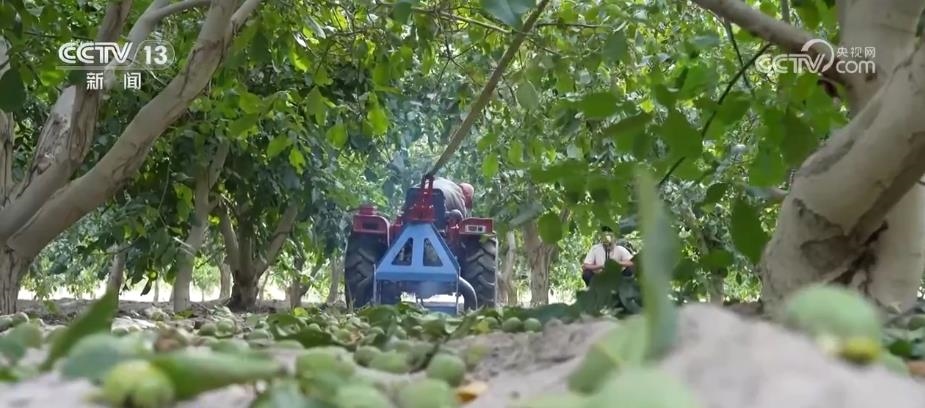 總臺記者 卜鵬:這里是位于新疆阿克蘇地區(qū)溫宿縣的一處核桃種植基地,這段時間正是當(dāng)?shù)睾颂页墒觳烧募竟?jié)。這些核桃樹上,一顆顆青綠渾圓的核桃掛滿枝頭,而在核桃樹底下,當(dāng)?shù)氐墓r(nóng)們正在抓緊撿收被抖落的核桃。為什么說是被抖落的核桃而不是被敲落的核桃?那是因為,在當(dāng)?shù)匾恍┓N植面積比較大的核桃基地里,當(dāng)?shù)氐墓r(nóng)會選擇利用農(nóng)業(yè)機械輔助抖動樹干的方式來采收核桃。采收的時候,果農(nóng)們會把繩索捆綁在核桃樹上,負責(zé)機械操作的師傅會根據(jù)樹枝的粗細來掌握和控制抖動的力度,這樣就能夠避免因為用力過猛而對樹枝產(chǎn)生傷害。經(jīng)過機器的搖擺,核桃就會接二連三落在地上,相比于人工采摘,機械采摘的方式效率會更高。