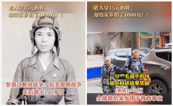 馬旭,我國第一代女空降兵,曾和黃繼光在同一部隊,參加過解放戰(zhàn)爭、抗美援朝戰(zhàn)爭。5年前的今天,年過八旬的馬旭夫婦去銀行匯款,因數額巨大,銀行工作人員擔心老人被騙報警,民警趕到現場后,核實發(fā)現兩位老人確實決定將畢生積蓄1000萬元,分兩次全部捐給家鄉(xiāng)。也正是這次“烏龍”,讓馬旭夫婦出現在了公眾視野。她曾獲評“感動中國2018年度人物”,頒獎詞是:你畢生節(jié)儉,只為一次奢侈,耐得清貧,守得心靈的高貴。