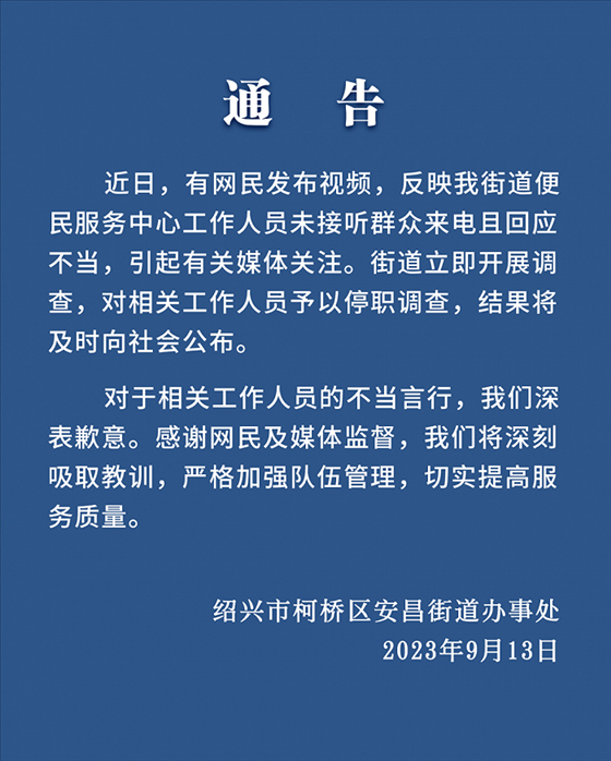 ·浙江紹興有市民發(fā)視頻稱,打不通安昌便民中心電話,來到現(xiàn)場發(fā)現(xiàn)工作人員都在聊天,吐槽電話是擺設。官方通報:相關工作人員停職調(diào)查。