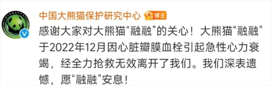大熊貓“融融”于2022年12月因心臟瓣膜血栓引起急性心力衰竭,經全力搶救無效離開了我們。我們深表遺憾,愿“融融”安息!