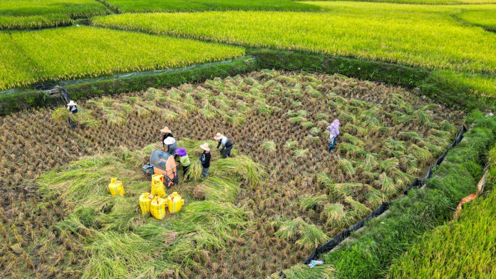 ↑2023年9月8日,貴州省黔南布依族苗族自治州羅甸縣沫陽(yáng)鎮(zhèn)紅星村,農(nóng)民在收割稻谷。CICPHOTO/史傳鴻 攝