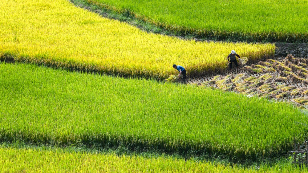 ↑2023年9月4日,湖南省東安縣舜皇山國(guó)家森林公園管理局塘家梯田,農(nóng)民在收割稻谷。CICPHOTO/嚴(yán)潔 攝