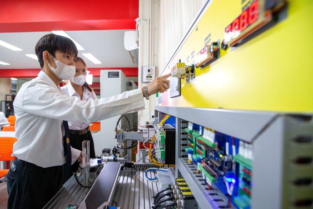 3月14日,在泰國(guó)大城府大城技術(shù)學(xué)院魯班工坊,學(xué)生在課堂上操作自動(dòng)化生產(chǎn)線(xiàn)安裝調(diào)試系統(tǒng)。新華社記者 王騰 攝