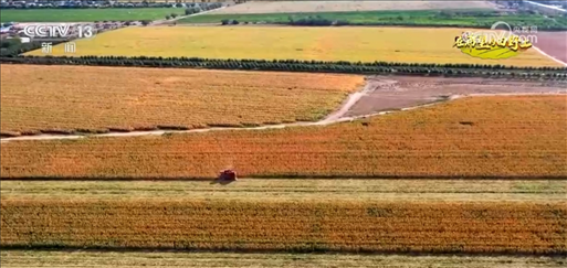 從和田市吉亞鄉(xiāng)上空俯瞰,沃野千里,一片金黃,一臺(tái)臺(tái)收割機(jī)正在忙著收玉米。今年,當(dāng)?shù)厥状瓮度肴詣?dòng)大型玉米收割機(jī),可以做到收割、剝皮、去芯、分離、脫粒一氣呵成,一次可以收割十四行玉米,大大提高了作業(yè)效率。