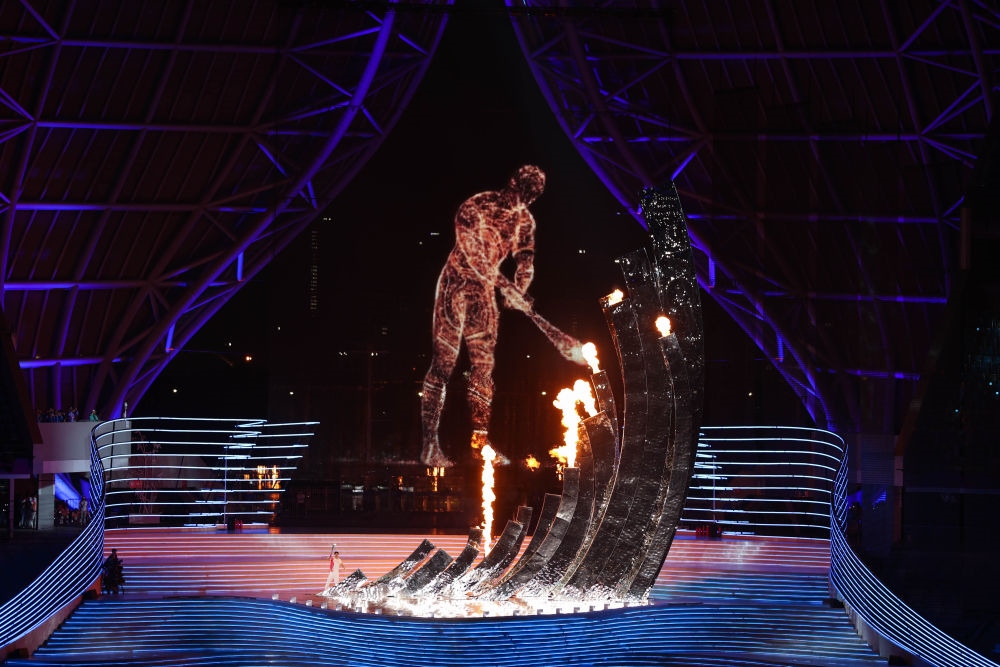 中國農(nóng)歷秋分節(jié)氣,杭州奧體中心體育場“大蓮花”燈光璀璨,萬涓成水,奔涌成潮?!皵?shù)字火炬手”與游泳運動員汪順共同點燃了象征亞洲大團結(jié)的體育之火,杭州第十九屆亞運會開幕。