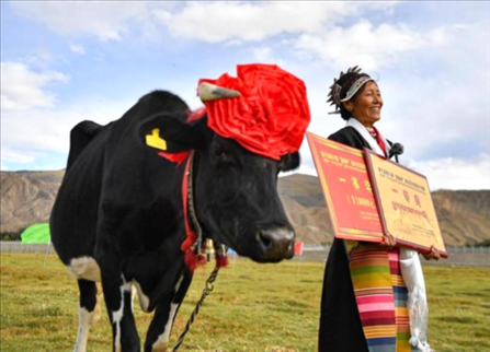 第六屆“聶雄杯”西藏高原·隆子黑白花優(yōu)質(zhì)奶牛競賽在西藏山南市隆子縣進(jìn)行決賽。按照早晚各一次現(xiàn)場擠奶稱總量計算、體形外貌和系譜檔案三條指標(biāo)進(jìn)行評比,一頭名叫“扎西”的奶牛奪冠。