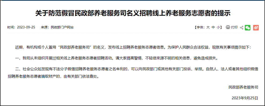 ·有機(jī)構(gòu)或個(gè)人冒用“民政部養(yǎng)老服務(wù)司”名義招聘志愿者,民政部發(fā)布提示。