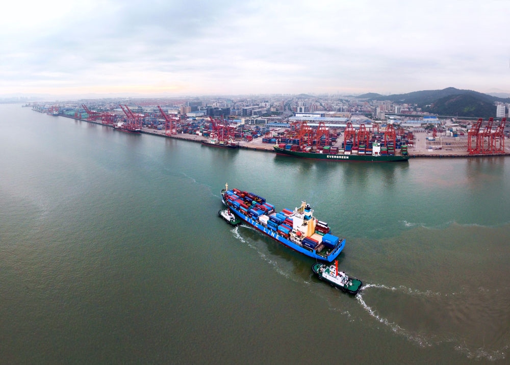 在福建自貿(mào)區(qū)廈門片區(qū)東渡港區(qū),一艘貨輪向碼頭靠攏(2017年8月26日無人機(jī)照片)。新華社記者 姜克紅 攝