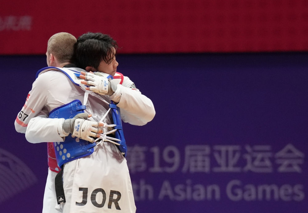 9月27日,韓國(guó)選手樸優(yōu)赫(右)在跆拳道男子80公斤級(jí)比賽后安慰約旦選手薩利赫·沙拉巴蒂。