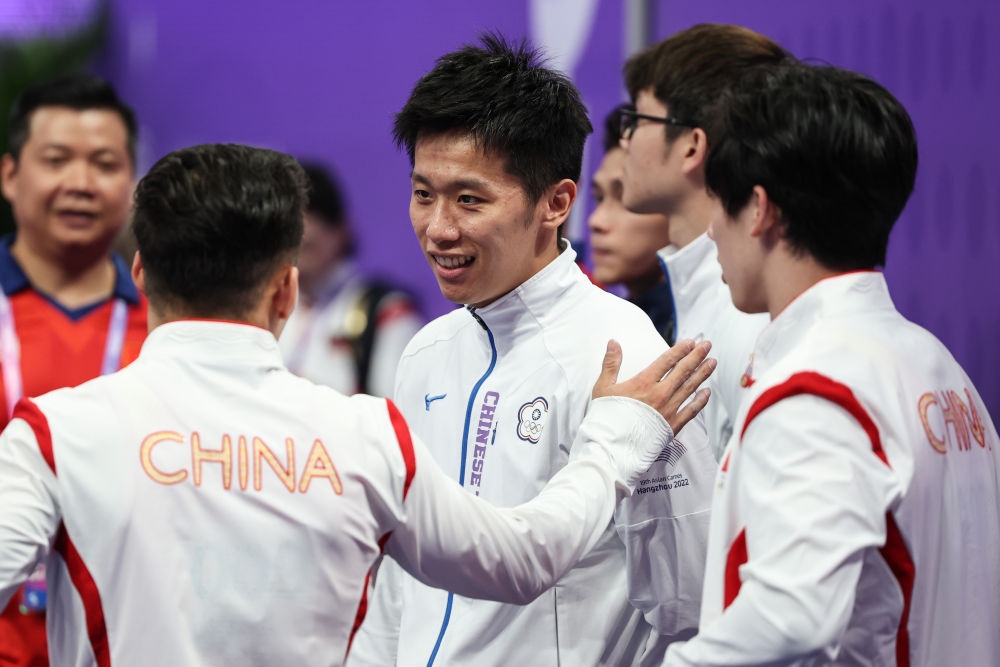 9月28日,中國(guó)臺(tái)北選手李智凱(中)和中國(guó)隊(duì)選手在體操鞍馬決賽中互致問候。