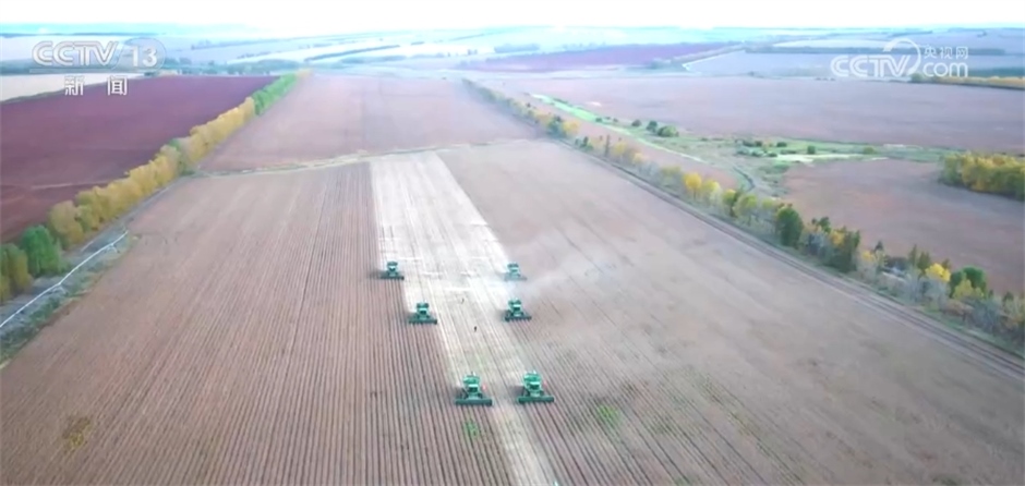 您現(xiàn)在看到的是黑龍江墾區(qū)鶴山農(nóng)場的大豆“高產(chǎn)攻關(guān)”示范田,眼下正是大豆收獲的高產(chǎn)期,農(nóng)場每天出動52臺收獲機,節(jié)糧減損,確保豐收的糧食顆粒歸倉。