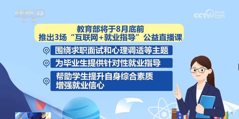 據了解,教育部將于8月底前推出3場“互聯(lián)網+就業(yè)指導”公益直播課,圍繞求職面試和心理調適等主題,為畢業(yè)生提供針對性就業(yè)指導,幫助學生提升自身綜合素質、增強就業(yè)信心。