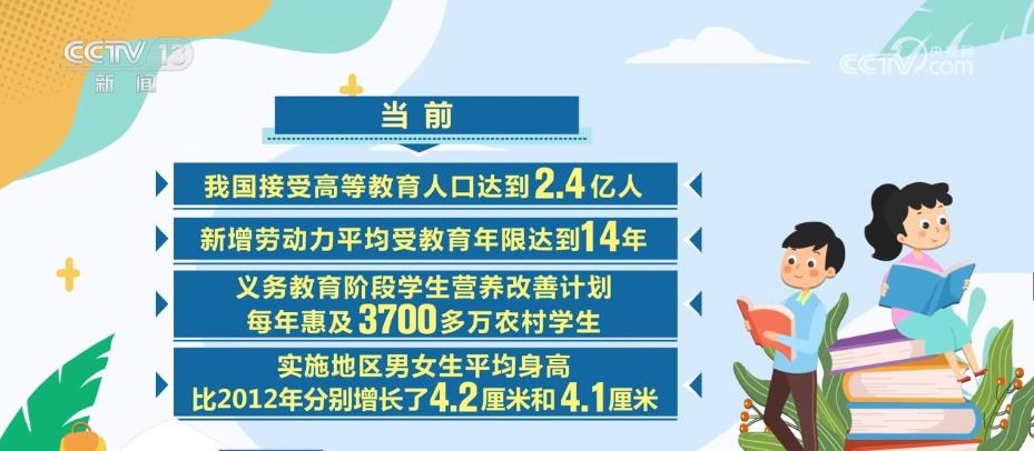 當(dāng)前,我國接受高等教育人口達(dá)到2.4億人,新增勞動力平均受教育年限達(dá)到14年。義務(wù)教育階段學(xué)生營養(yǎng)改善計劃每年惠及3700多萬農(nóng)村學(xué)生,實(shí)施地區(qū)男女生平均身高比2012年分別增長了4.2厘米和4.1厘米。