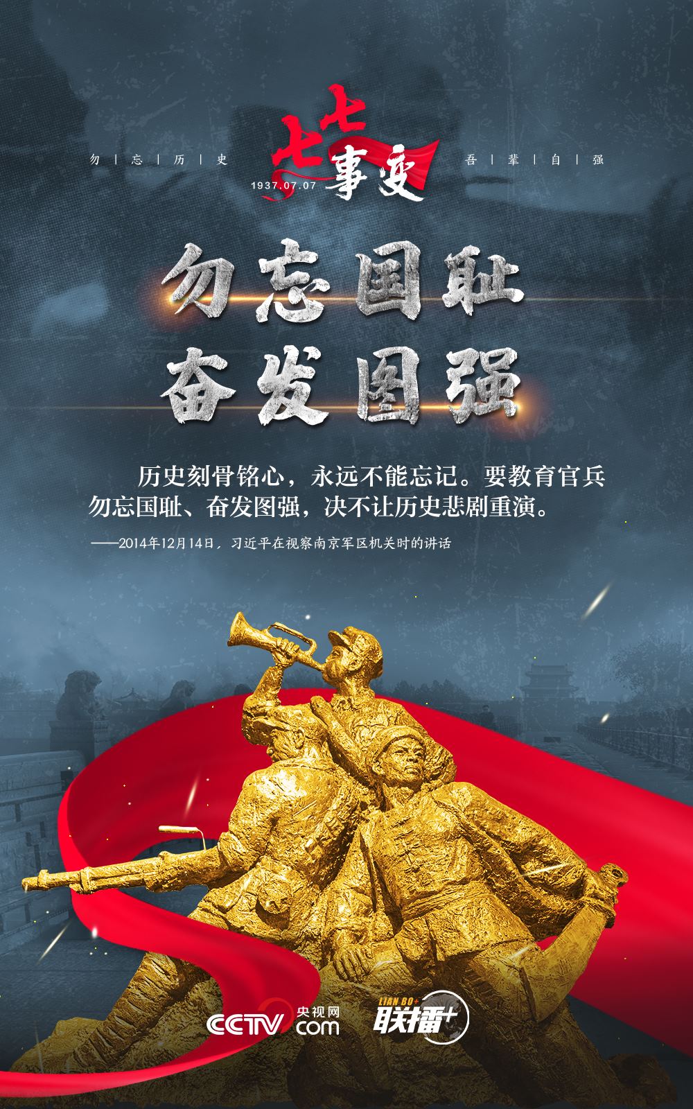 悼念同胞,緬懷先烈。勿忘歷史,吾輩自強(qiáng)!在“七七事變”86周年之際,央視網(wǎng)《聯(lián)播+》欄目特推出海報(bào),與您一起從總書記講話中汲取自強(qiáng)不息的奮進(jìn)力量。
